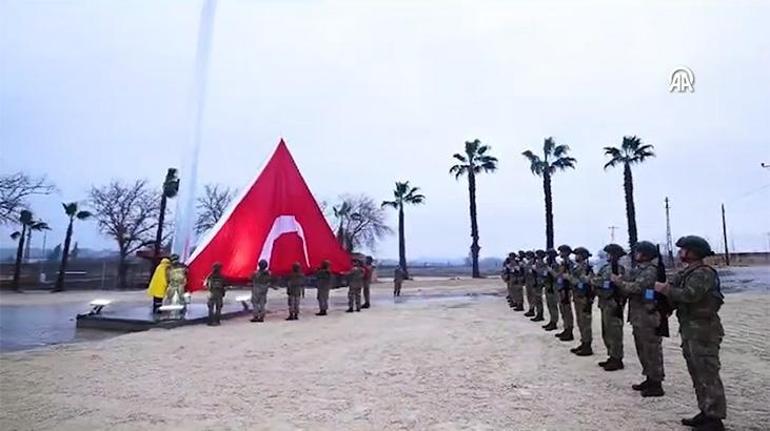 Suriye'nin Kamışlı kentinin Türkiye'ye en yakın noktası olan alana, gerekli önlemlerin alınmasının ardından, 30 metre uzunluğunda bir bayrak direği yerleştirildi ve dev Türk bayrağı göndere çekildi.